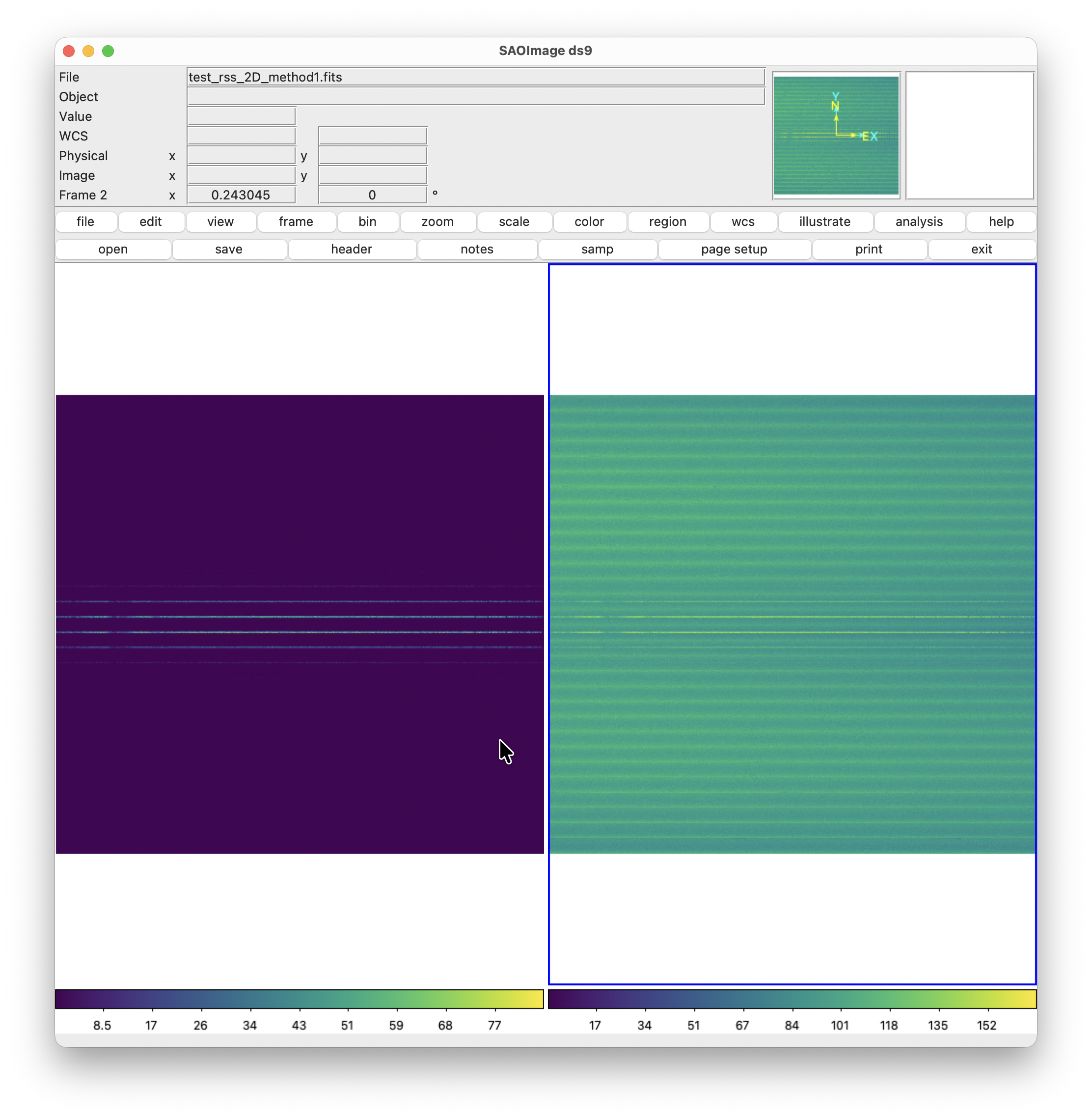 It is possible to compare the two RSS images (before and after the simulation) using ds9. Note that the simulated RSS exhibit a background pattern corresponding to the bias level that, in addition, is not homogeneous. This reflects the fact that each