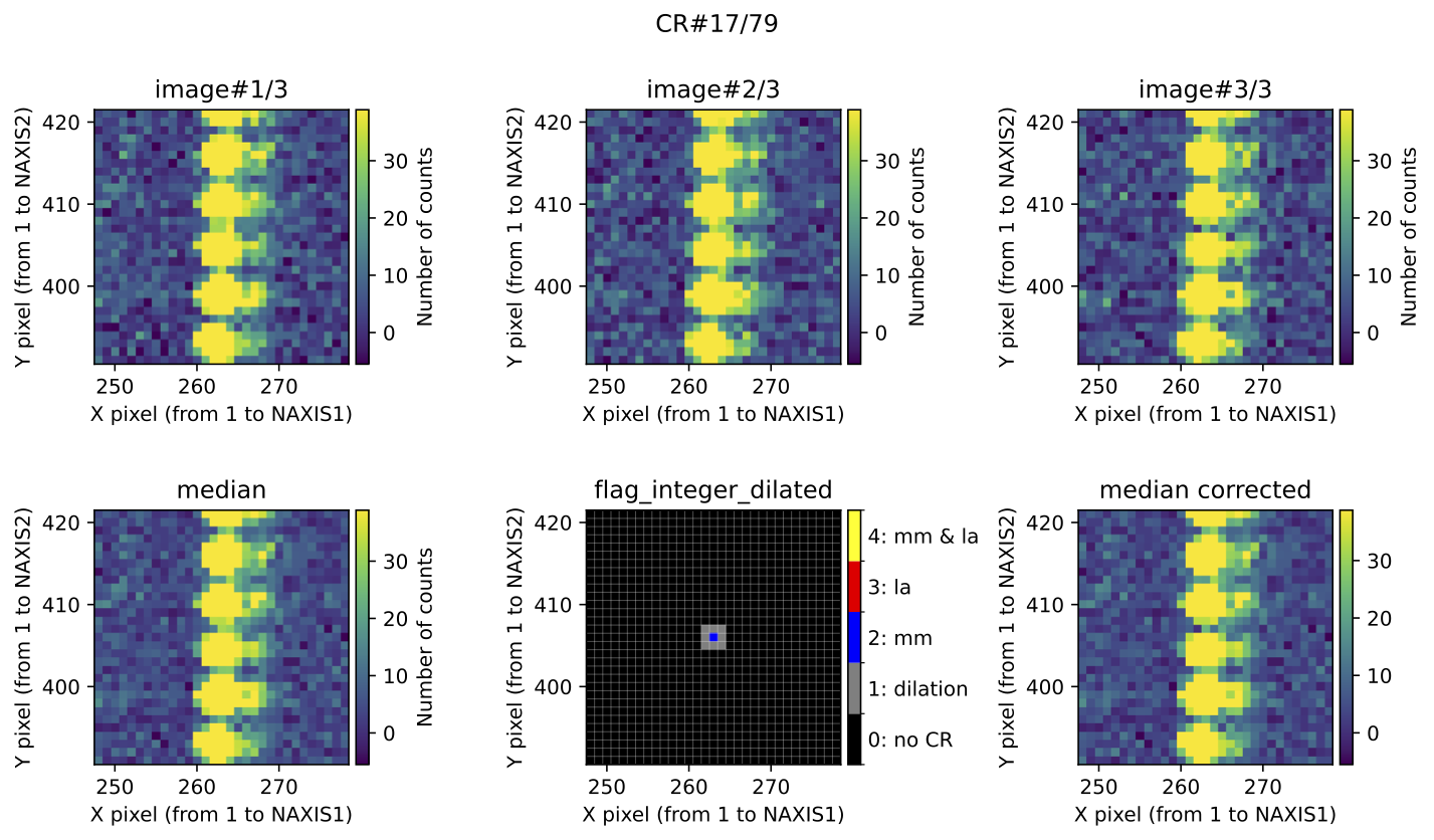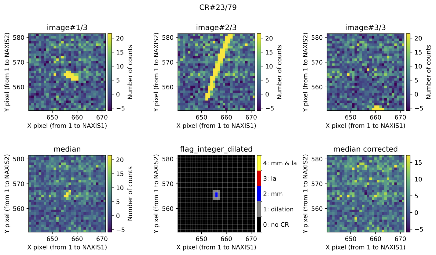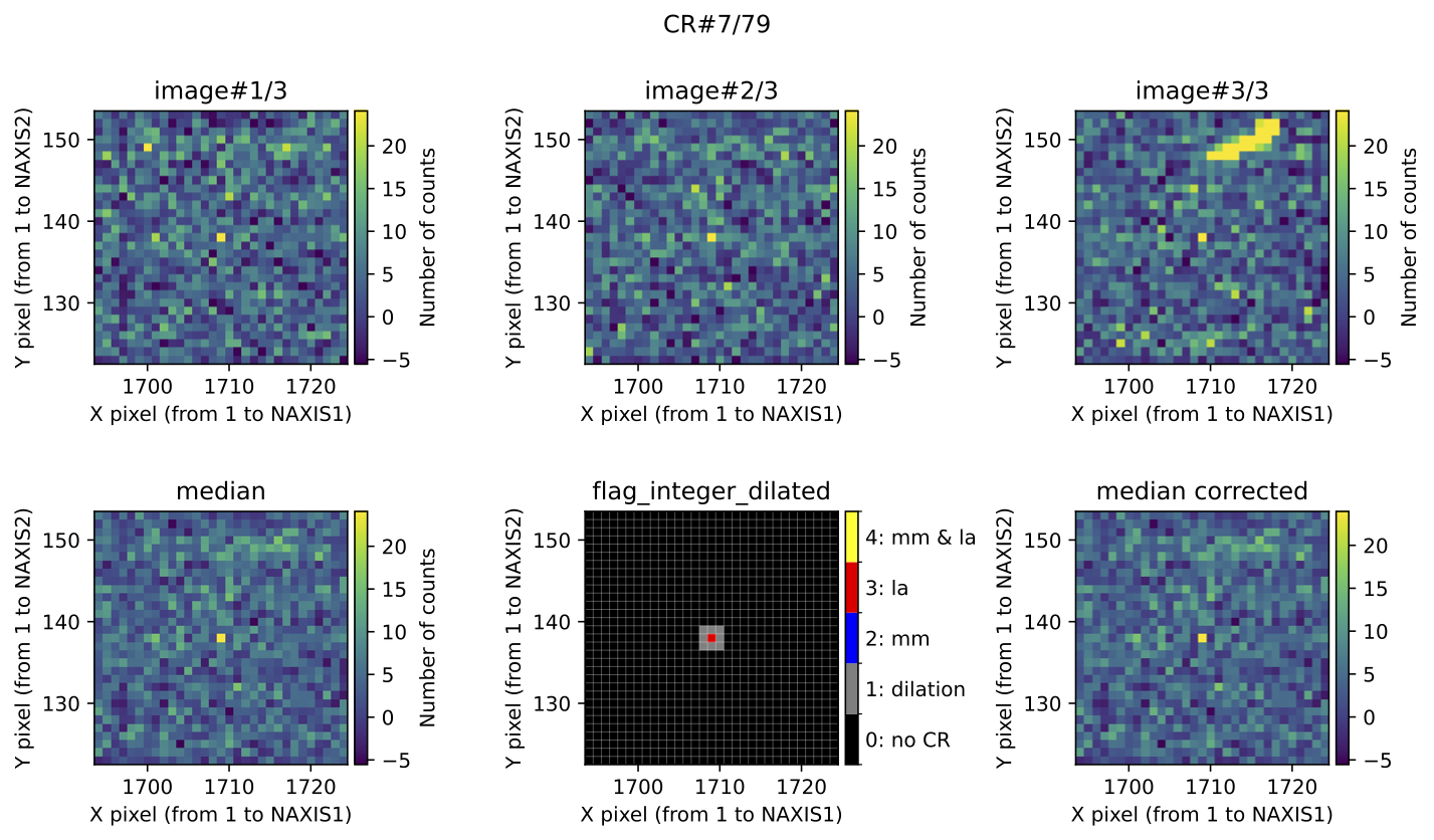 dilation(integer): Specifies the dilation factor used to expand the mask around detected cosmic ray pixels. A value of 0 disables dilation. A value of 1 is typically recommended, as it helps include the tails of cosmic rays, which may have lower signal levels but are still affected.regions_to_be_skipped(list of \(\color{green}\texttt{[xmin, xmax, ymin, ymax]}\) regions). The format of each region must be a list of 4 integers, following the FITS conventionpixels_to_be-flagged_as_cr(list of \(\color{green}\texttt{[X,Y]}\) pixel coordinates; FITS criterium).pixels_to_be_ignored_as_cr(list of \(\color{green}\texttt{[X,Y]}\) pixel coordinates; FITS criterium).pixels_to_be_replaced_by_local_median(list of \(\color{green}\texttt{[X, Y, X_width, Y_width]}\) values): \(\color{green}\texttt{X, Y}\) pixel coordinates (FITS criterium), and median window size \(\color{green}\texttt{X_width, Y_width}\) to compute the local median (these two numbers must be odd).verify_cr(boolean): If set to True, the code displays a graphical representation of the pixels detected as cosmic rays during the computation of the \(\color{magenta}\texttt{MEDIANCR}\) mask, allowing the user to decide whether or not to include those pixels in the final mask.semiwindow(integer): Defines the semiwindow size (in pixels) used when plotting the double cosmic ray hits. This parameter is only used ifplotsis set to True.color_scale(string): Specifies the color scale used in the images displayed in themediancr_identified_cr.pdffile. This option is only relevant ifplotsis set to True. Valid values are \(\color{green}\texttt{minmax}\) and \(\color{green}\texttt{zscale}\).maxplots(integer): Sets the maximum number of suspicious double cosmic rays to display. Limiting the number of plots is useful when experimenting with program parameters, as it helps avoid generating an excessive number of plots due to false positives. A negative value means all suspected double CRs will be displayed (note that this may significantly increase execution time). This option is only used ifplotsis True.