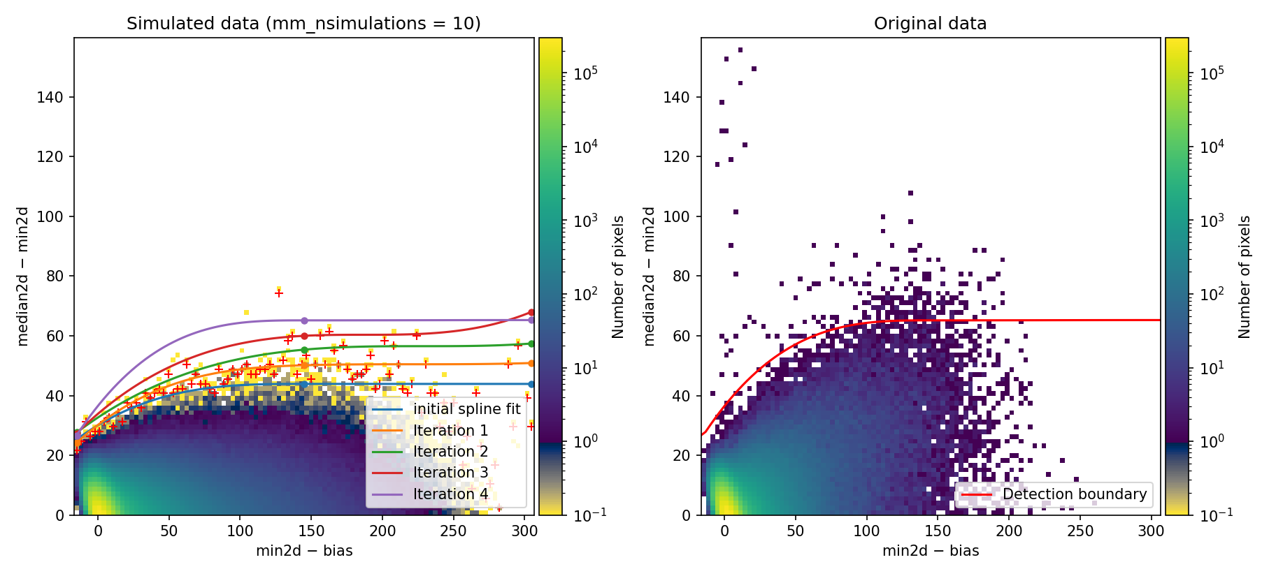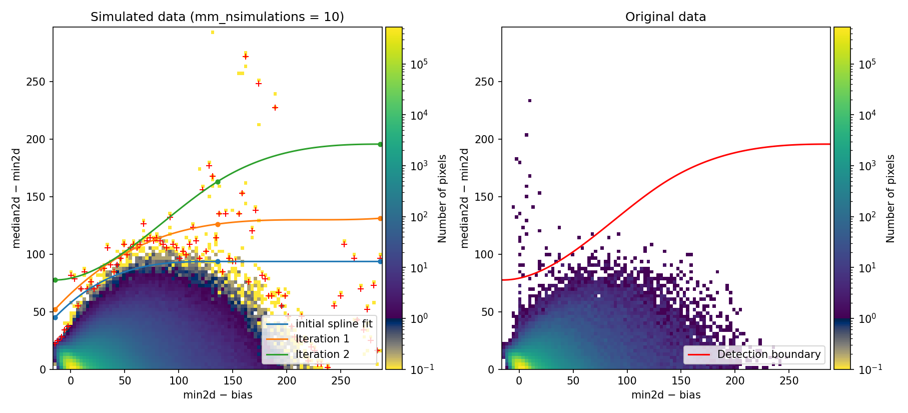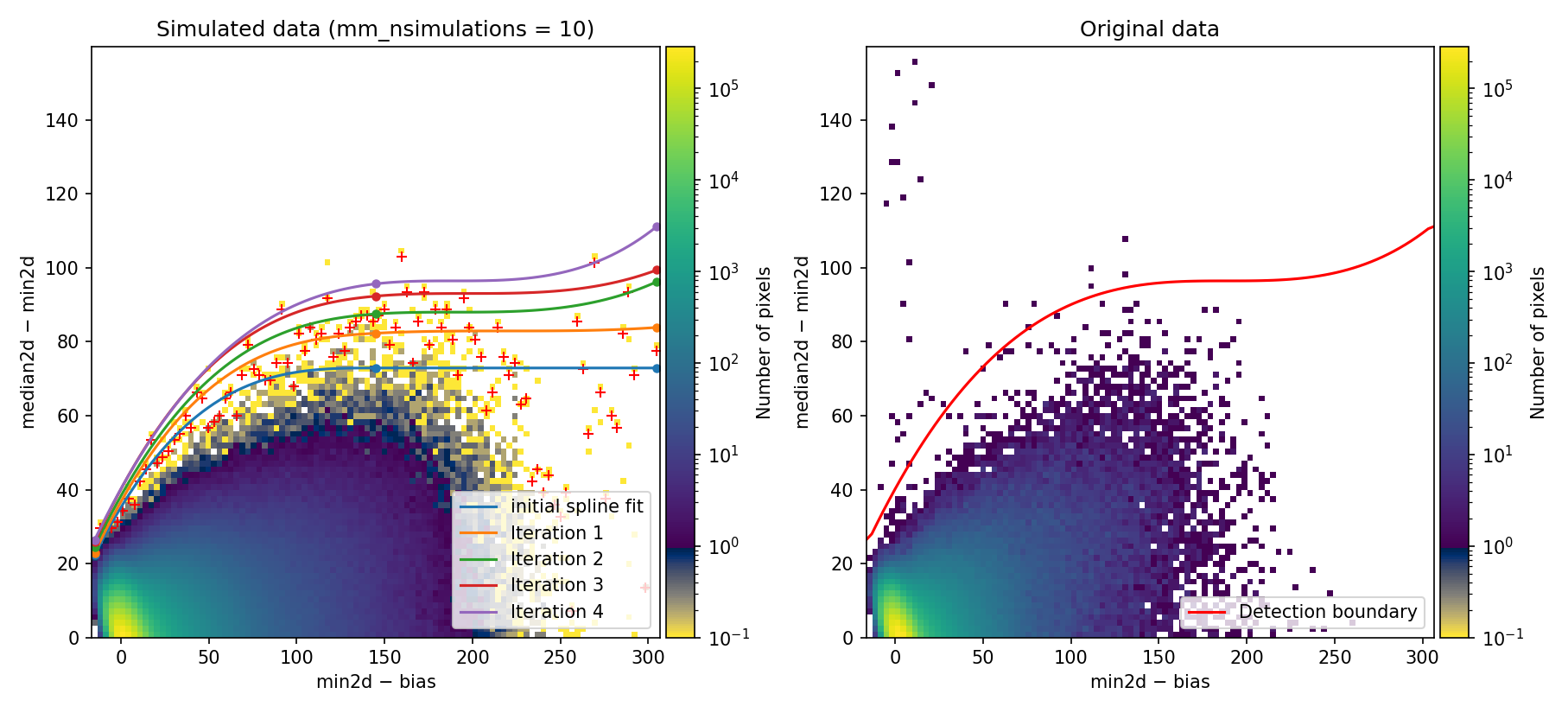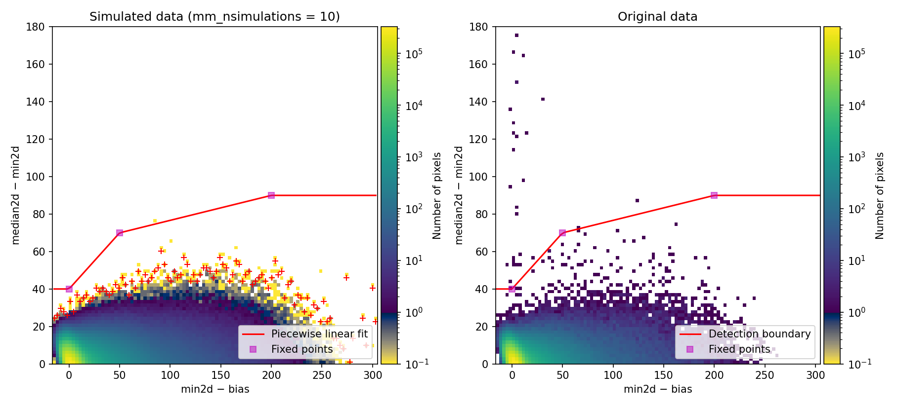 mm_knots_splfit(integer): Total number of knots employed in the spline fit that define the detection boundary in the diagnostic diagram.mm_fixed_points_in_boundary(list of \(\color{green}\texttt{[X, Y, weight]}\)): Points used to fit the detection boundary in the MM diagnostic diagram. In the case of apiecewisefit, the boundary is constructed using straight lines connecting the specified points. If a \(\texttt{spline}\) fit is used, the manually provided points are combined with simulated ones. In the first case, each point is specified on a separate line in the YAML file using the format \(\color{green}\texttt{[X, Y]}\). In the second case, the format is \(\color{green}\texttt{[X, Y, weight]}\), where the weight is optional and should be a large number (default 1000 when not provided) to ensure that the numerical fit closely follows the manually specified points.mm_nsimulations(integer): Number of simulations to perform for each collection of exposures when generating the simulated diagnostic diagram.mm_niter_boundary_extension(integer): Number of iterations used to extend the detection boundary above the red crosses in the simulated diagnostic diagram, improving the robustness of cosmic ray detection by reducing the number of false positives. This option is only employed whenmm_boundary_fit=\(\color{green}\texttt{spline}\).mm_weight_boundary_extension(float): Weight applied to the vertical distance between fitted points in the diagnostic diagram when extending the detection boundary above the red crosses. During each iteration, points above the previous fit are multiplied by this weight raised to the power of the iteration number. This forces the fit to better align with the upper boundary defined by the red crosses in the simulated diagnostic diagram, improving the accuracy of cosmic ray detection.mm_threshold(float): Minimum threshold for themedian2d - min2dvalue in the diagnostic diagram. This acts as an additional constraint beyond the detection boundary (pixels with values below this threshold are not considered as suspected cosmic ray hits).mm_minimum_max2d_rnoise(float): Minimum value ofmax2d, expressed in readout noise units, required to consider a pixel as a double cosmic ray. This helps avoid false positives caused by large negative values in one of the individual exposures.mm_seed(integer or None): Sets the random seed used when generating the simulated diagnostic diagram. If set to None, the seed is randomly generated, resulting in slightly different simulations each time.