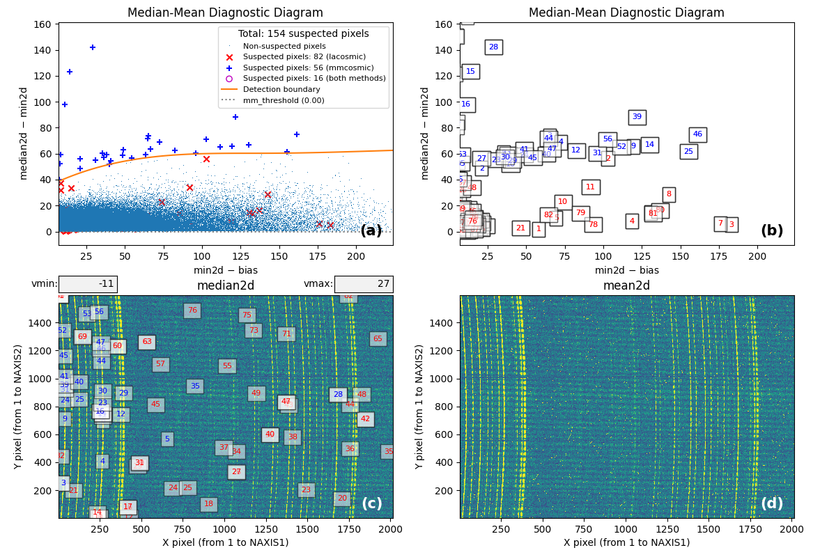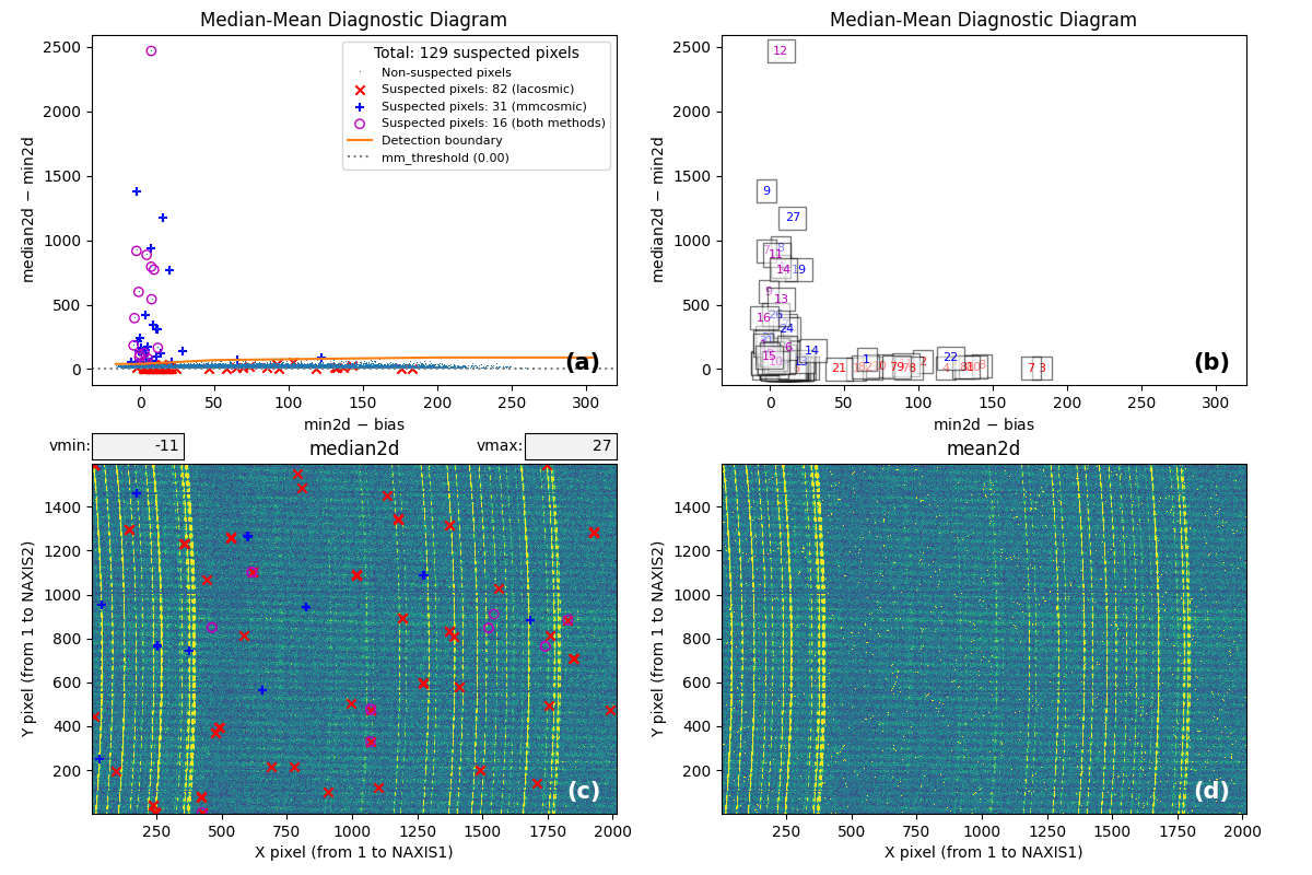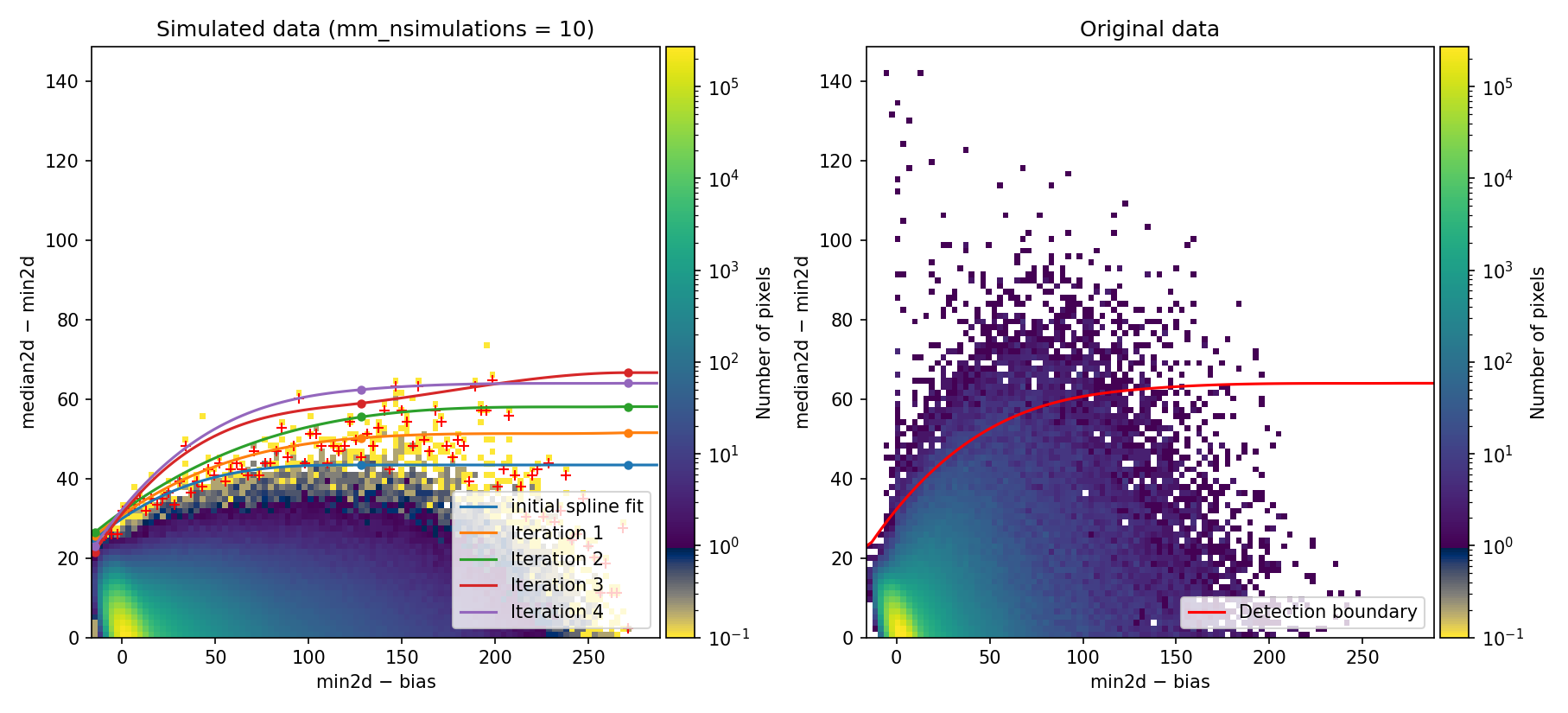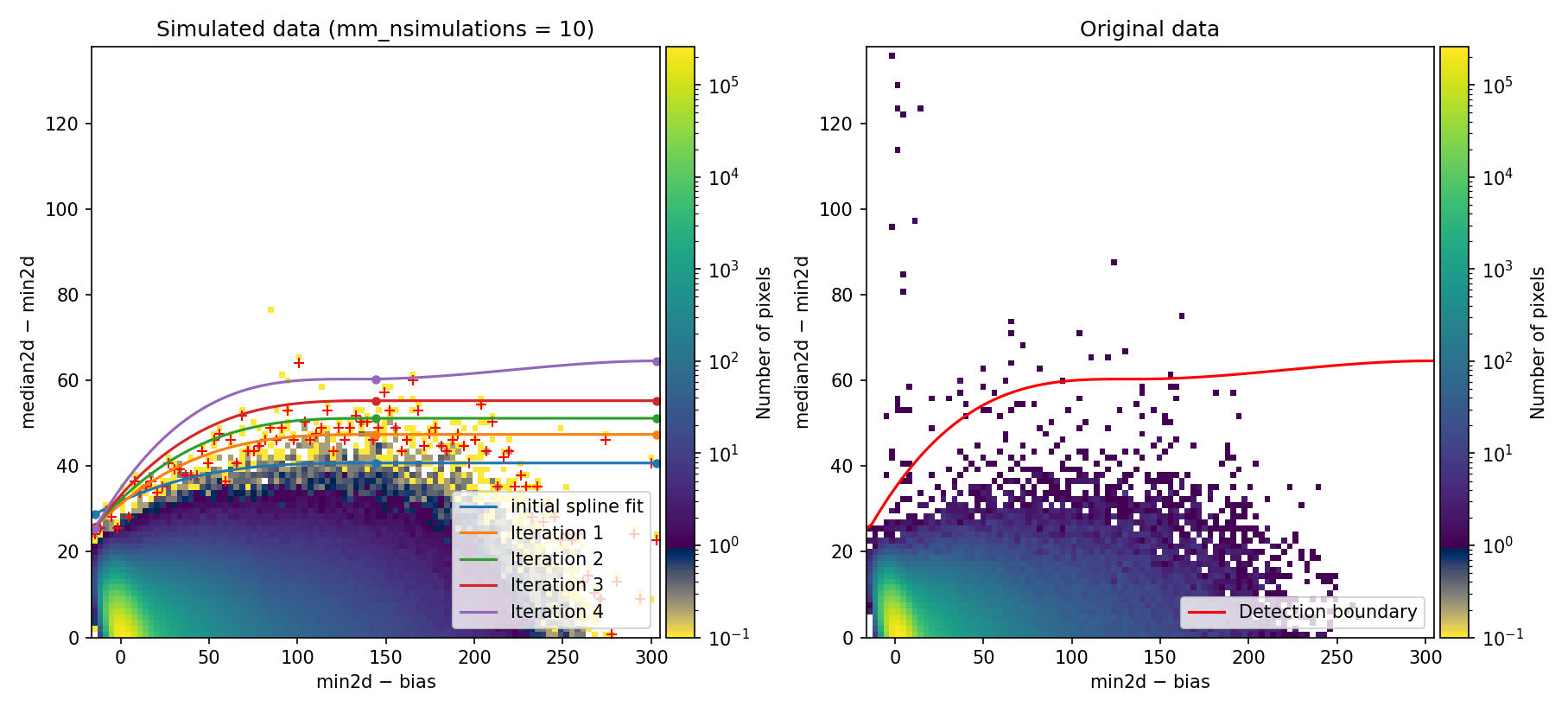 mm_knots_splfit(integer): Total number of knots employed in the spline fit that define the detection boundary in the diagnostic diagram.mm_fixed_points_in_boundary(list of \(\color{green}\texttt{[X, Y, weight]}\)): Points used to fit the detection boundary in the MM diagnostic diagram. In the case of apiecewisefit, the boundary is constructed using straight lines connecting the specified points. If a \(\texttt{spline}\) fit is used, the manually provided points are combined with simulated ones. In the first case, each point is specified on a separate line in the YAML file using the format \(\color{green}\texttt{[X, Y]}\). In the second case, the format is \(\color{green}\texttt{[X, Y, weight]}\), where the weight is optional and should be a large number (default 1000 when not provided) to ensure that the numerical fit closely follows the manually specified points.mm_nsimulations(integer): Number of simulations to perform for each collection of exposures when generating the simulated diagnostic diagram.mm_niter_boundary_extension(integer): Number of iterations used to extend the detection boundary above the red crosses in the simulated diagnostic diagram, improving the robustness of cosmic ray detection by reducing the number of false positives. This option is only employed whenmm_boundary_fit=\(\color{green}\texttt{spline}\).mm_weight_boundary_extension(float): Weight applied to the vertical distance between fitted points in the diagnostic diagram when extending the detection boundary above the red crosses. During each iteration, points above the previous fit are multiplied by this weight raised to the power of the iteration number. This forces the fit to better align with the upper boundary defined by the red crosses in the simulated diagnostic diagram, improving the accuracy of cosmic ray detection.mm_threshold(float): Minimum threshold for themedian2d - min2dvalue in the diagnostic diagram. This acts as an additional constraint beyond the detection boundary (pixels with values below this threshold are not considered as suspected cosmic ray hits).mm_minimum_max2d_rnoise(float): Minimum value ofmax2d, expressed in readout noise units, required to consider a pixel as a double cosmic ray. This helps avoid false positives caused by large negative values in one of the individual exposures.mm_seed(integer or None): Sets the random seed used when generating the simulated diagnostic diagram. If set to None, the seed is randomly generated, resulting in slightly different simulations each time.