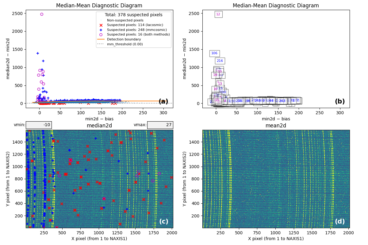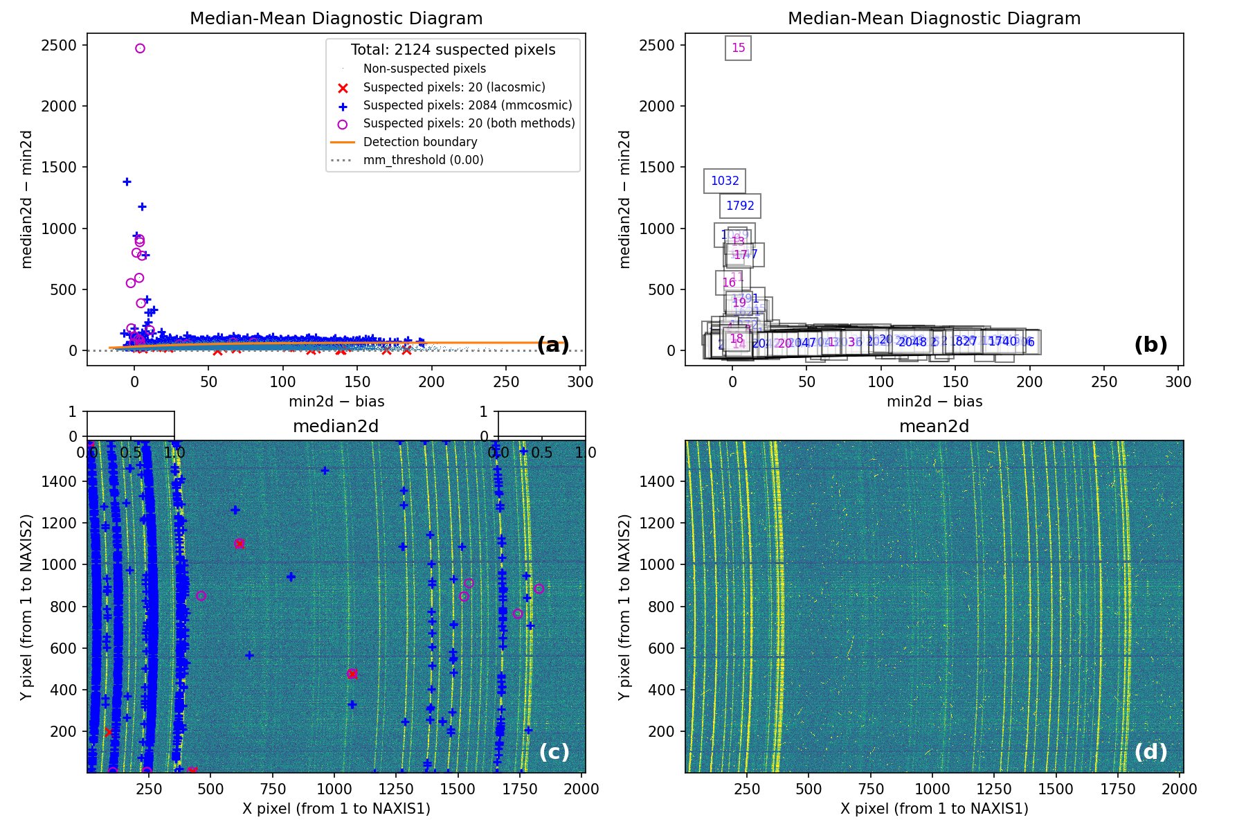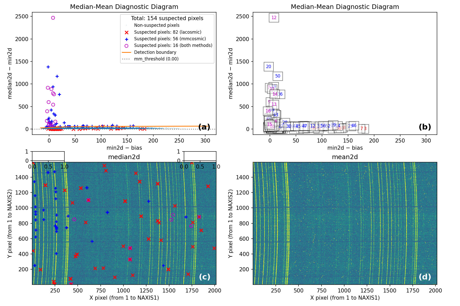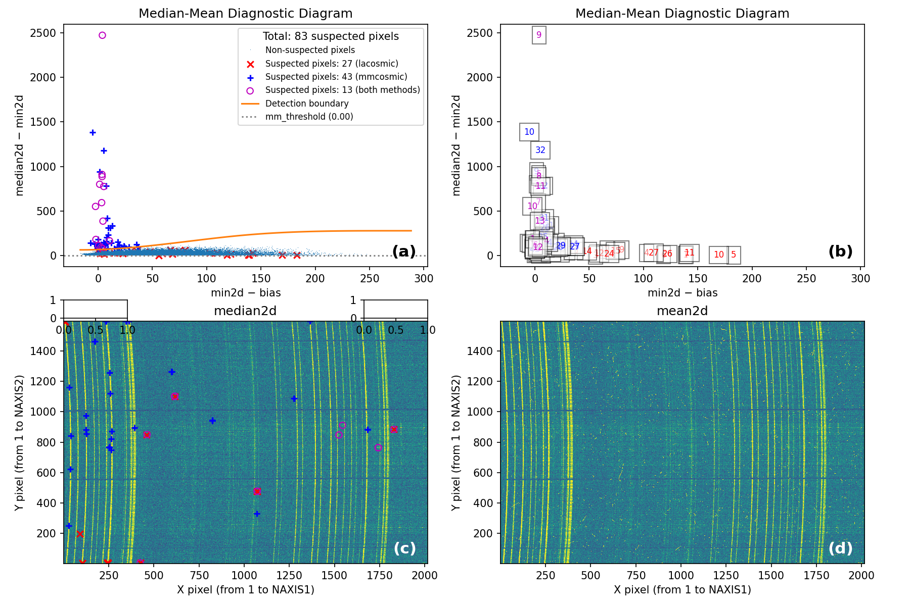 mm_knots_splfit(integer): Total number of knots employed in the spline fit that define the detection boundary in the diagnostic diagram.mm_fixed_points_in_boundary(list of \(\color{green}\texttt{[X, Y, weight]}\)): Points used to fit the detection boundary in the MM diagnostic diagram. In the case of apiecewisefit, the boundary is constructed using straight lines connecting the specified points. If a \(\texttt{spline}\) fit is used, the manually provided points are combined with simulated ones. In the first case, each point is specified on a separate line in the YAML file using the format \(\color{green}\texttt{[X, Y]}\). In the second case, the format is \(\color{green}\texttt{[X, Y, weight]}\), where the weight is optional and should be a large number (default 1000 when not provided) to ensure that the numerical fit closely follows the manually specified points.mm_nsimulations(integer): Number of simulations to perform for each collection of exposures when generating the simulated diagnostic diagram.mm_niter_boundary_extension(integer): Number of iterations used to extend the detection boundary above the red crosses in the simulated diagnostic diagram, improving the robustness of cosmic ray detection by reducing the number of false positives. This option is only employed whenmm_boundary_fit=\(\color{green}\texttt{spline}\).mm_weight_boundary_extension(float): Weight applied to the vertical distance between fitted points in the diagnostic diagram when extending the detection boundary above the red crosses. During each iteration, points above the previous fit are multiplied by this weight raised to the power of the iteration number. This forces the fit to better align with the upper boundary defined by the red crosses in the simulated diagnostic diagram, improving the accuracy of cosmic ray detection.mm_threshold(float): Minimum threshold for themedian2d - min2dvalue in the diagnostic diagram. This acts as an additional constraint beyond the detection boundary (pixels with values below this threshold are not considered as suspected cosmic ray hits).mm_minimum_max2d_rnoise(float): Minimum value ofmax2d, expressed in readout noise units, required to consider a pixel as a double cosmic ray. This helps avoid false positives caused by large negative values in one of the individual exposures.mm_seed(integer or None): Sets the random seed used when generating the simulated diagnostic diagram. If set to None, the seed is randomly generated, resulting in slightly different simulations each time.
