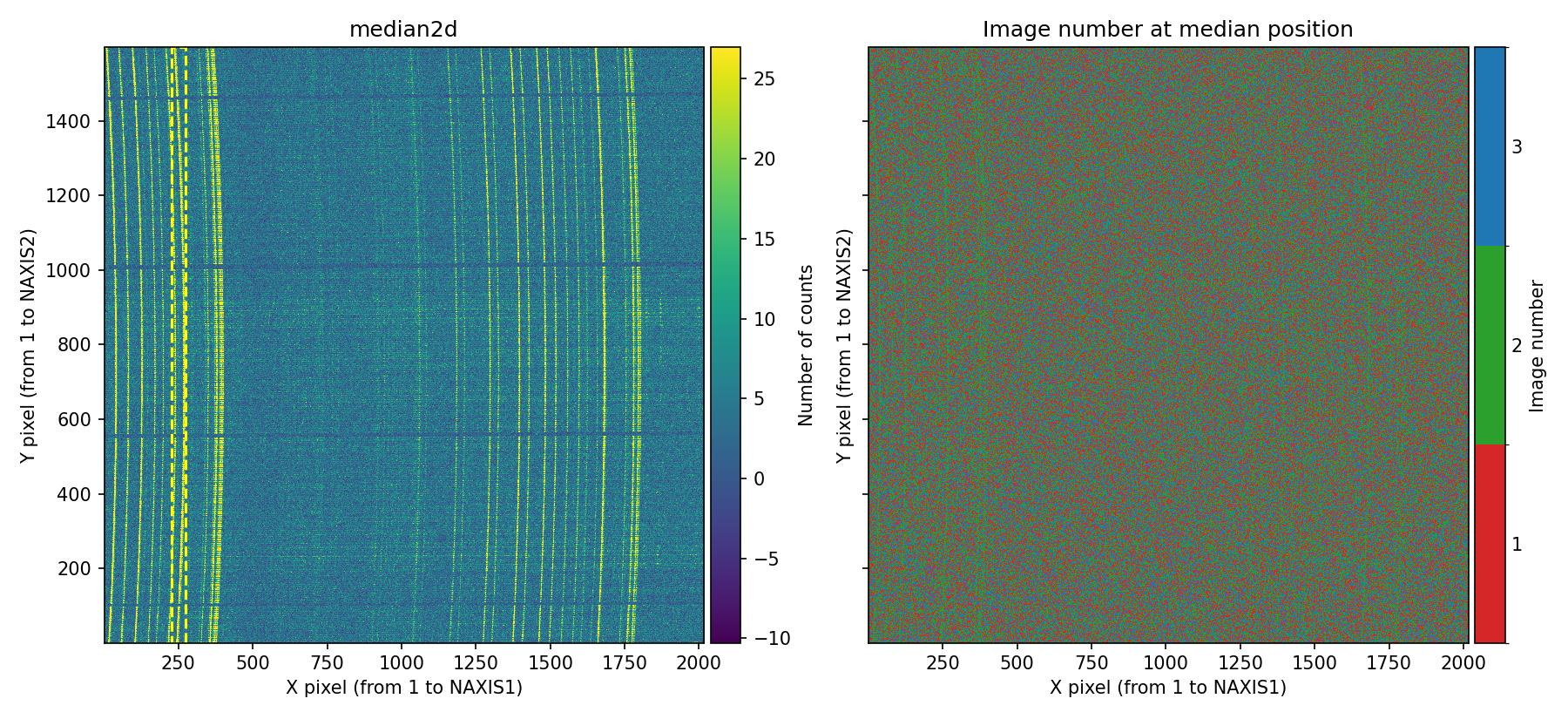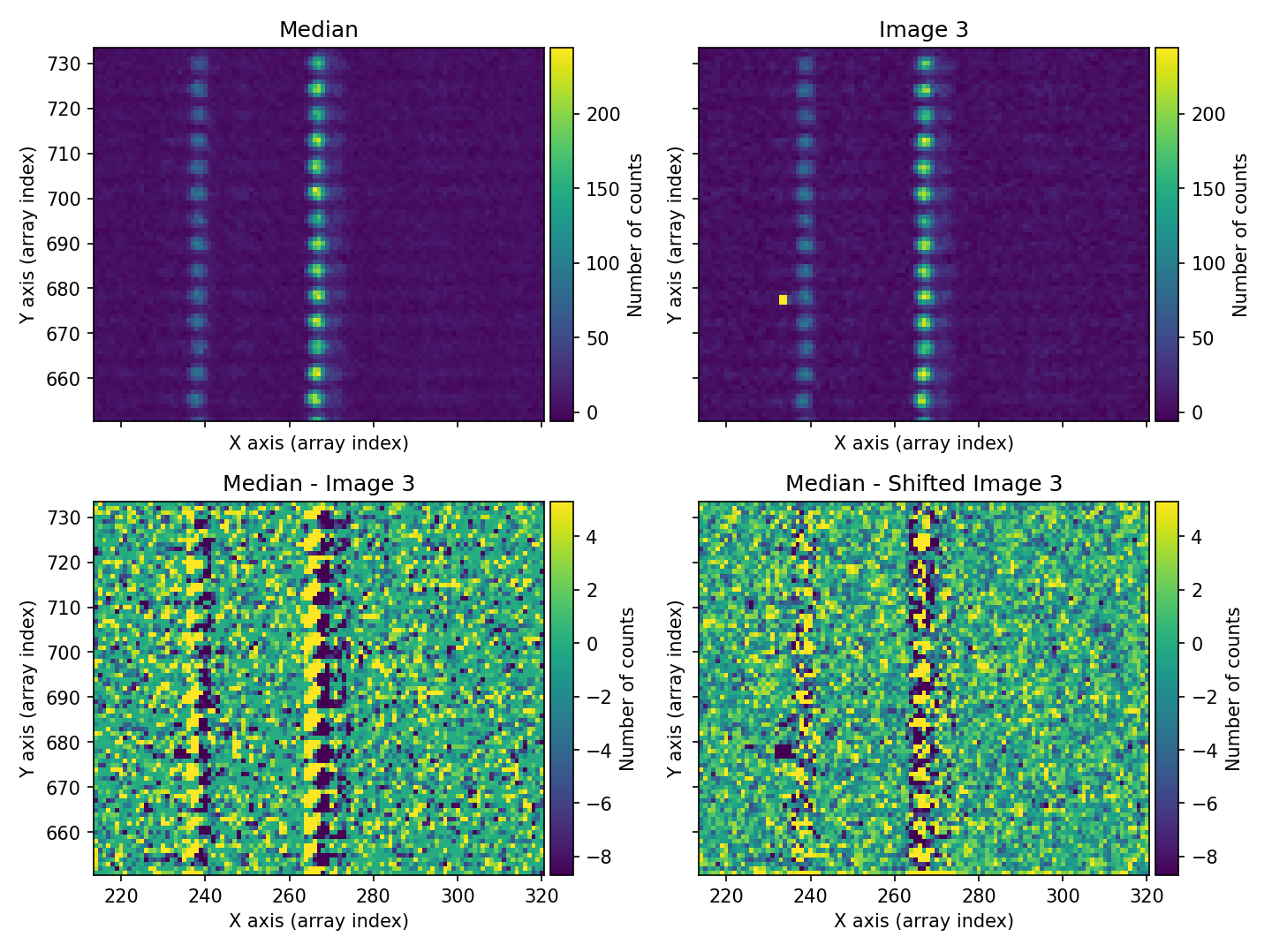 When generating the diagnostic diagram, “numina-crmasks” applies the calculated offsets to the median image in order to simulate three exposures that have the same relative displacements as the original three exposures.