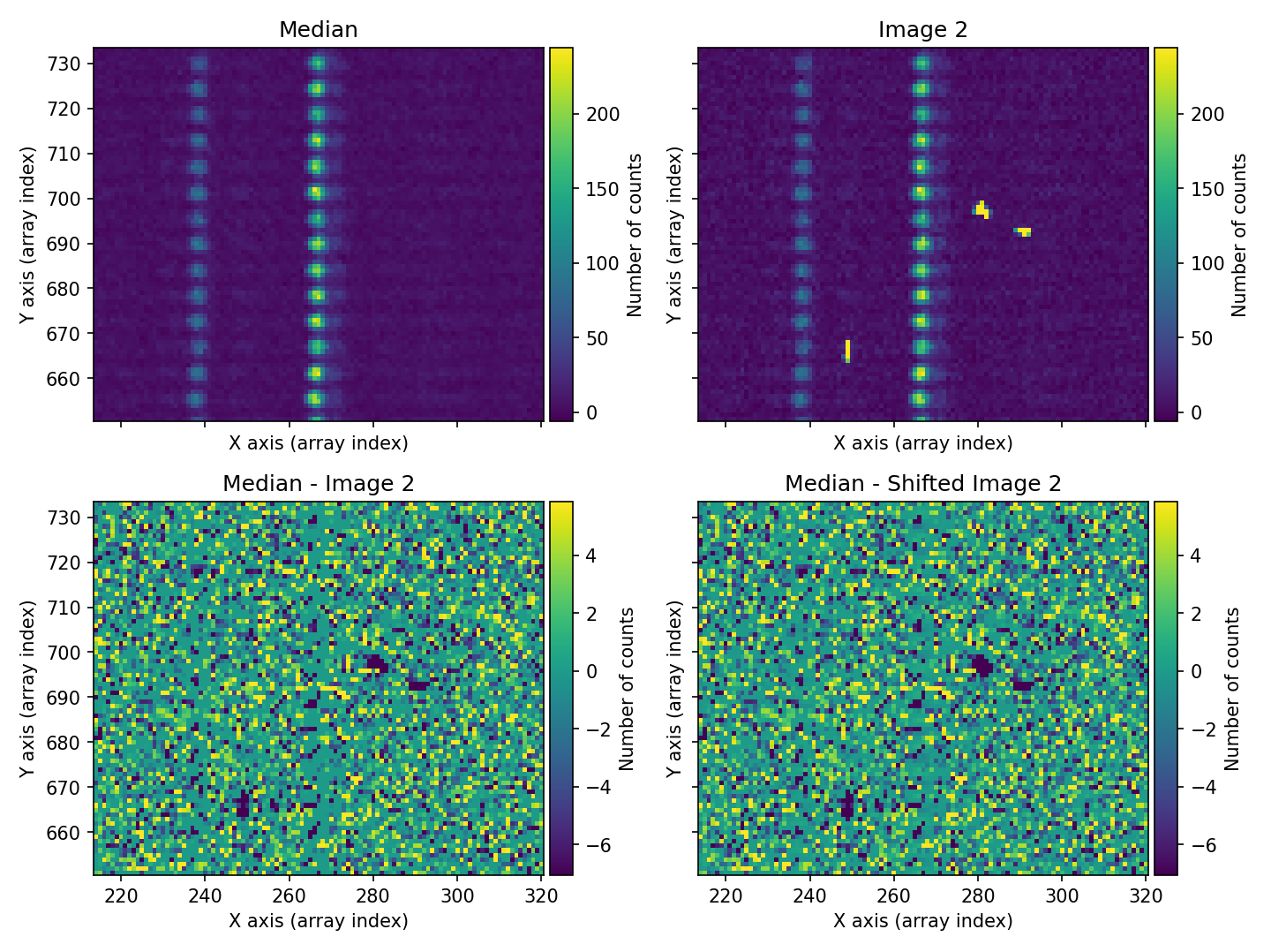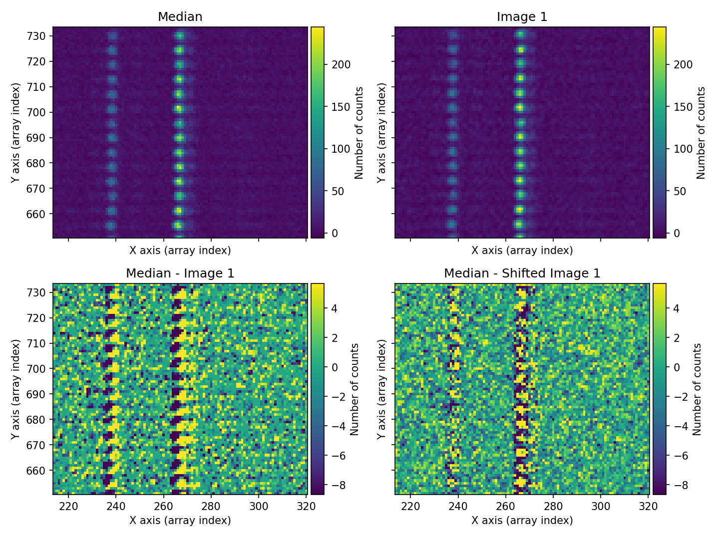 Fig. 15 For each individual exposure, the program displays a figure with four panels. In the top row, we have the median combination (left panel) and the corresponding individual image (right panel). In the bottom row, we see the difference between both images (left panel) and the same result after the individual image has been shifted by applying the (X, Y) offsets calculated using the 2D cross-correlation method (right panel). In this case, the situation for the first individual exposure is shown. The offset between the median and that exposure is clearly visible (bottom-left panel), and after applying the calculated offset, the difference between the median and the shifted individual image becomes much more consistent with the exposures being properly aligned.